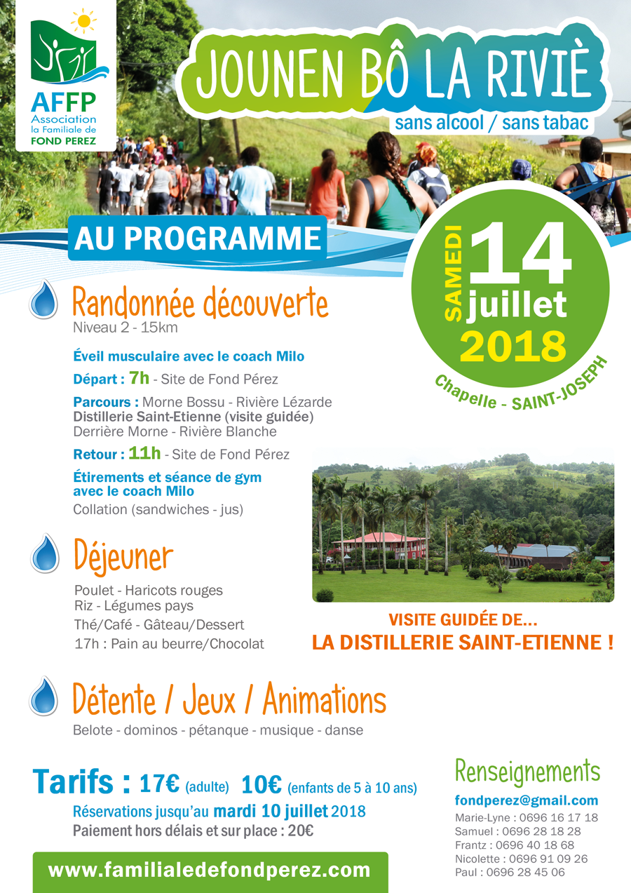 Samedi 14 Juillet 2018 a lieu notre traditionnelle « Jounen Bô la Riviè » ! Et cette fois, nous vous avons programmé une visite guidée de la Distillerie Saint-Etienne durant la randonnée du matin. Ne manquez pas ce rendez-vous !