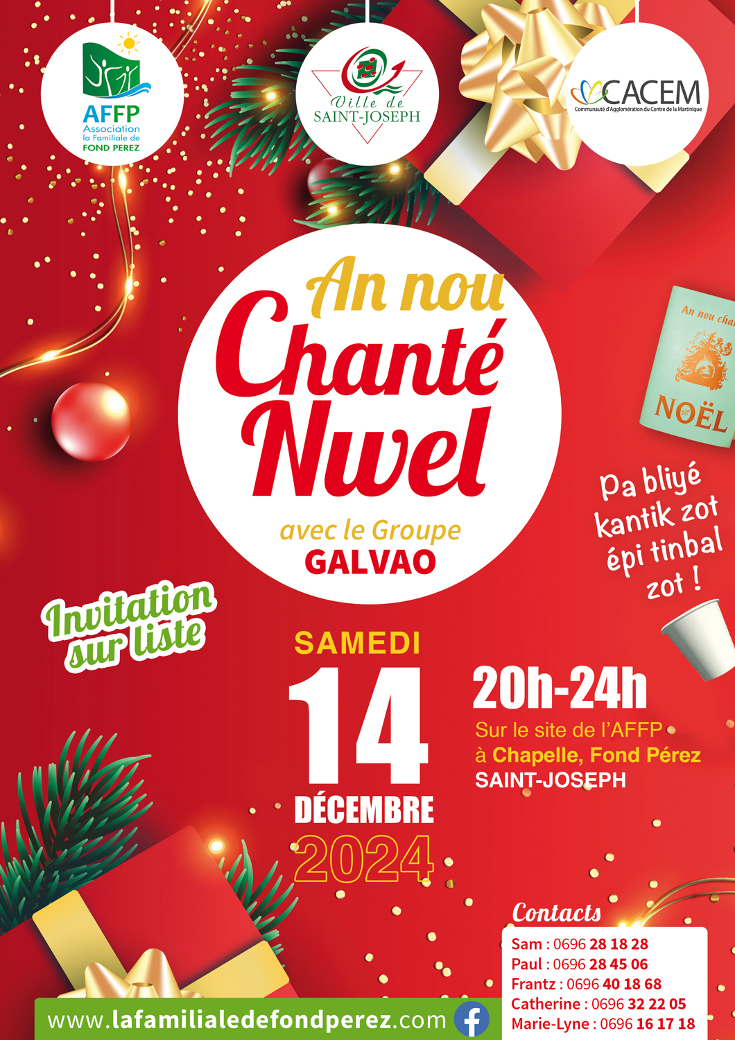 Alors, samedi 14 décembre 2024, venez faire entendre votre voix de 20h à minuit avec le groupe GALVAO, sur notre site de Chapelle à Saint-Joseph.Pa bliyé kantik zot épi vini chanté Nwel !